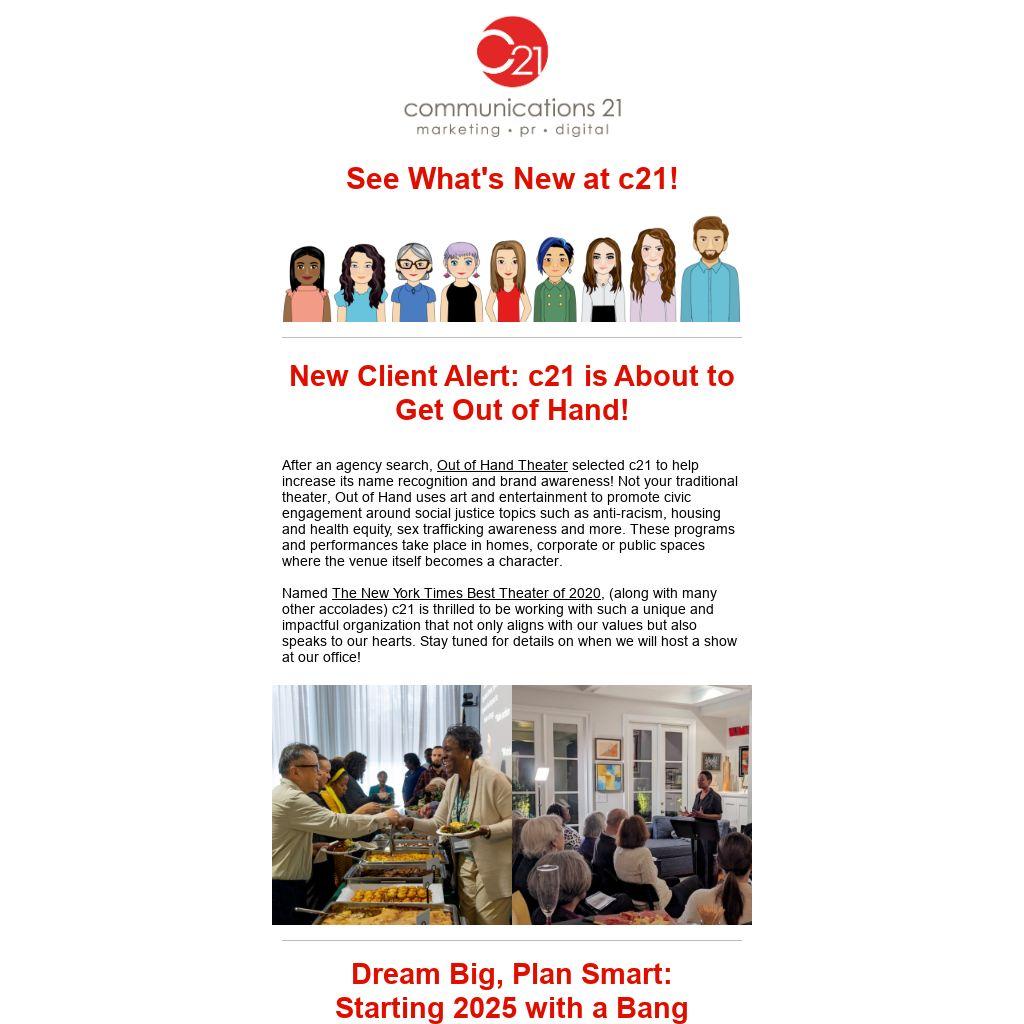 After an agency search, Out of Hand Theater selected c21 to help increase its name recognition and brand awareness! Not your traditional theater, Out of Hand uses art and entertainment to promote civic engagement around social justice topics such as anti-racism, housing and health equity, sex trafficking awareness and more. These programs and performances take place in homes, corporate or public spaces where the venue itself becomes a character.