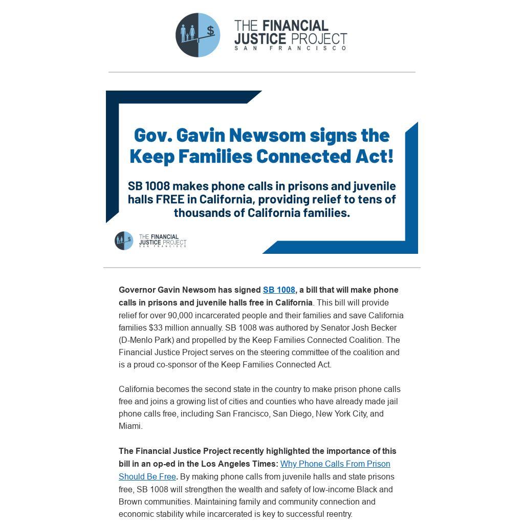 Governor Gavin Newsom has signed SB 1008, a bill that will make phone calls in prisons and juvenile halls free in California. This bill will provide relief for over 90,000 incarcerated people and their families and save California families $33 million annually. SB 1008 was authored by Senator Josh Becker (D-Menlo Park) and propelled by the Keep Families Connected Coalition. The Financial Justice Project serves on the steering committee of the coalition and is a proud co-sponsor of the Keep Families Connected Act.