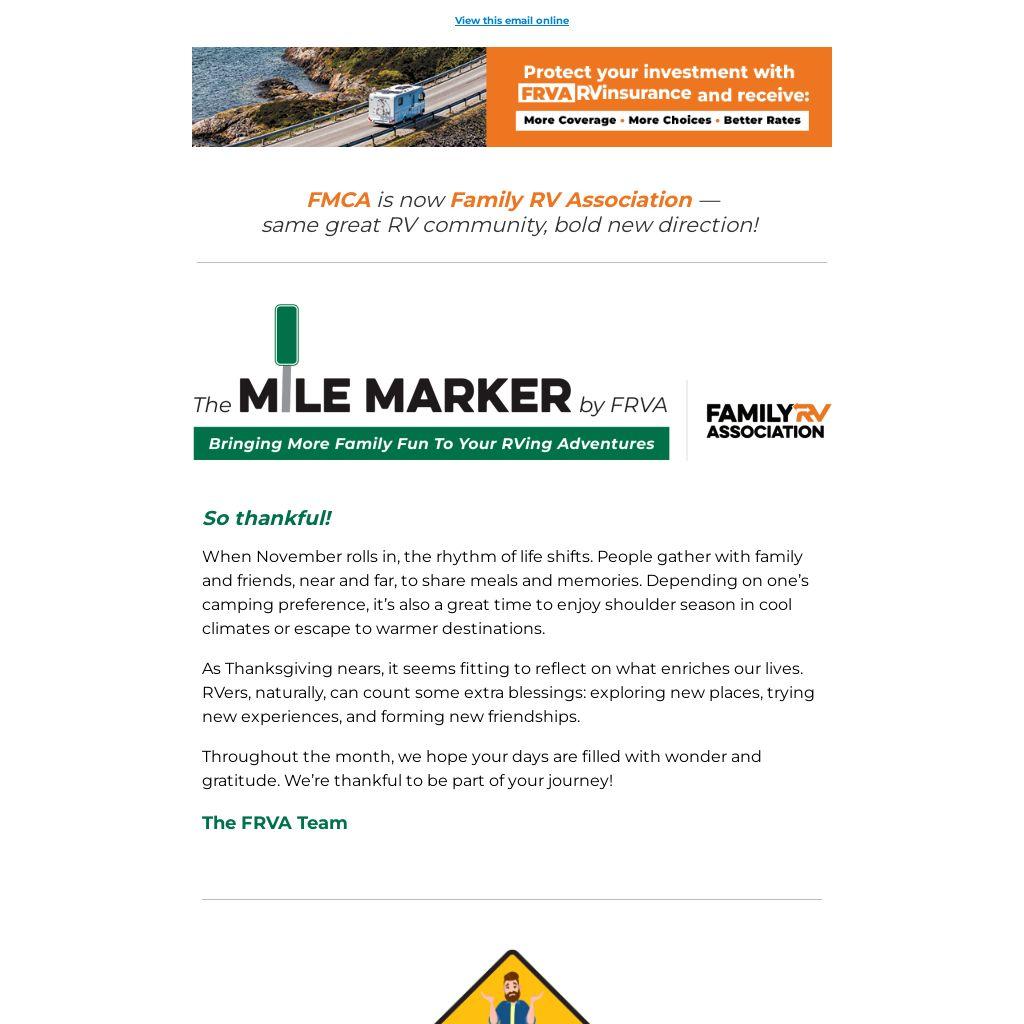 You're in control of your email preferences, and you must be logged into your Family RV Association (previously Family Motor Coach Association/FMCA) membership account to manage your preferences.