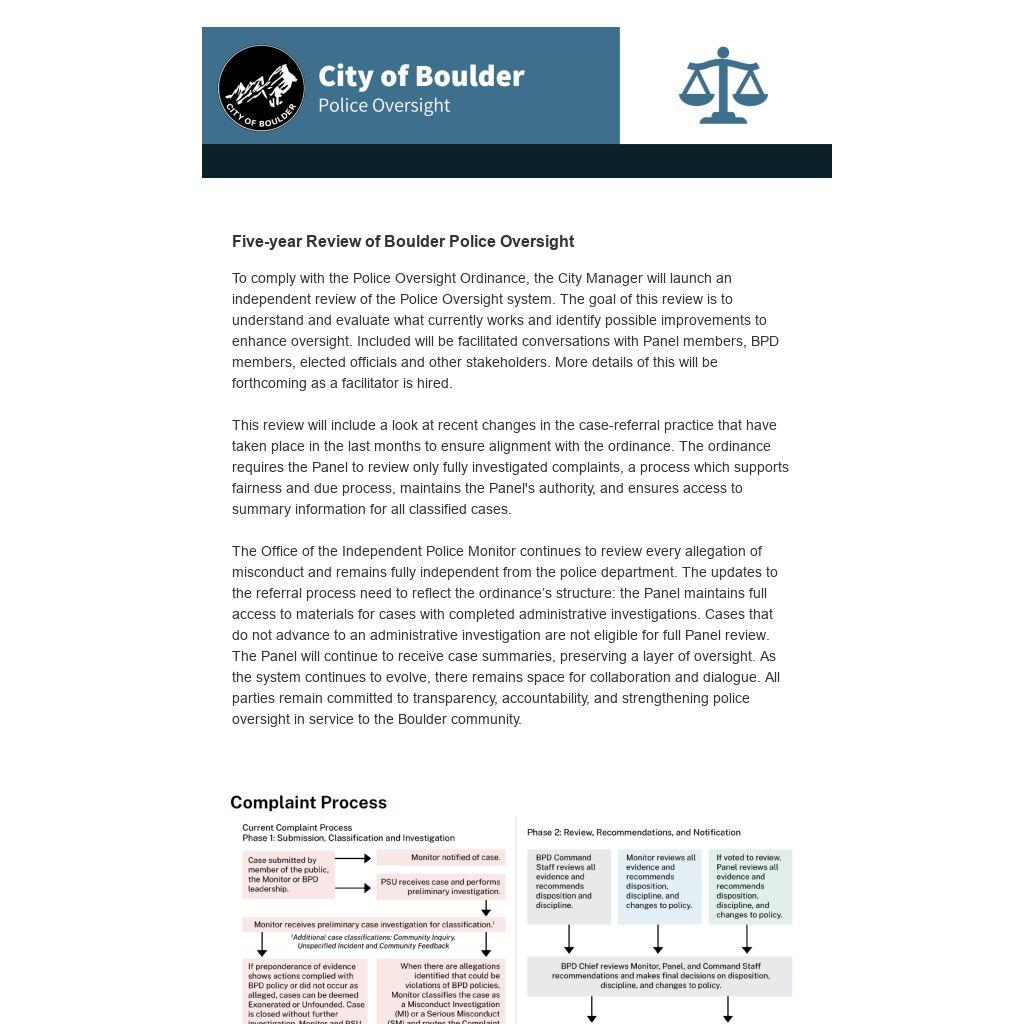 Applications for all Police Oversight Panel, and all board and commission vacancies, are open now through Sunday, Jan. 25, 2026. The Panel will have openings for both regular and student members. Membership on the Panel requires mandatory training, including a ride along with the Boulder Police Department (BPD), with an expected average time commitment of 10 hours per month, and a monthly $200 stipend. Panel members are expected to attend meetings the 2nd Monday of each month, participate in case reviews and engage with the Boulder community. Case review involves reviewing completed misconduct investigations and making recommendations to BPD.
