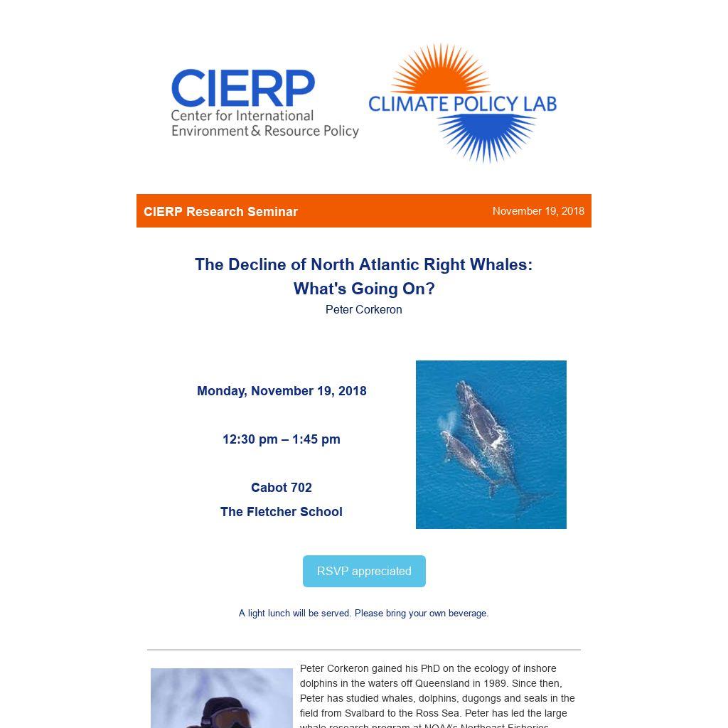Peter Corkeron gained his PhD on the ecology of inshore dolphins in the waters off Queensland in 1989. Since then, Peter has studied whales, dolphins, dugongs and seals in the field from Svalbard to the Ross Sea. Peter has led the large whale research program at NOAA’s Northeast Fisheries Science Center since 2011. The primary focus of the large whale research program is to assess the status of, and the anthropogenic and ecological factors influencing, North Atlantic right whales. Peter's work also includes assessing the effects of noise on large whales, developing new technology to enhance our understanding of whales' behavior and ecology, and applying these technologies to improve conservation outcomes for whales.