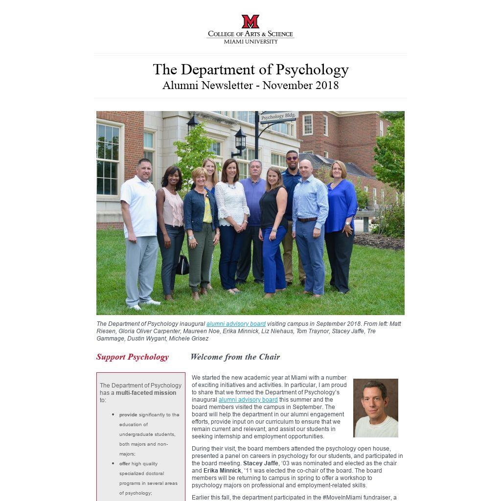 | We started the new academic year at Miami with a number of exciting initiatives and activities. In particular, I am proud to share that we formed the Department of Psychology’s inaugural alumni advisory board this summer and the board members visited the campus in September. The board will help the department in our alumni engagement efforts, provide input on our curriculum to ensure that we remain current and relevant, and assist our students in seeking internship and employment opportunities. During their visit, the board members attended the psychology open house, presented a panel on careers in psychology for our students, and participated in the board meeting. Stacey Jaffe, ‘03 was nominated and elected as the chair and Erika Minnick, ‘11 was elected the co-chair of the board. The board members will be returning to campus in spring to offer a workshop to psychology majors on professional and employment-related skills. The department also participated in the Discover the Sciences event hosted by the College of Arts and Sciences for high school seniors interested in pursuing education in science. We were among the 12 departments discussing the undergraduate experience at Miami, including curriculum, research opportunities, and beyond the classroom activities. Three undergraduate students and their mentors showcased their research at this event, talked to prospective students interested in psychology and neuroscience, and provided tours of psychology facilities. One of the major strengths of our department has been faculty engagement in grant-funded research. This fall, Dr. Allen McConnell and colleagues from Cincinnati Children’s Hospital were awarded funding from the National Institute of Child Health and Human Development to support research on “Human-animal interaction to promote recovery following pediatric brain injury,” where a multidisciplinary team including psychologists, nurses, physicians, and occupational therapists will study the value of using therapy dogs in rehab efforts involving children suffering from acquired brain injuries. Congratulations, Allen! To build on these strengths of high quality research and teaching, the department is currently searching for and anticipates hiring two faculty members in social psychology. We are excited to have these new colleagues join the psychology department community. It has been an energizing start of the academic year and we look forward to continued engagement over the course of the year. Please stay connected with us and look for the spring newsletter next semester. We wish you a happy holiday season.