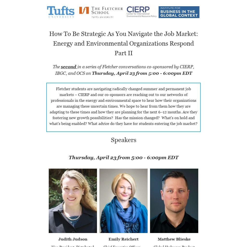 Fletcher students are navigating radically changed summer and permanent job markets – CIERP and our co-sponsors are reaching out to our networks of professionals in the energy and environmental space to hear how their organizations are managing these uncertain times. We hope to hear from them how they are adapting to these times and how they are planning for the next 6–12 months. Are they fostering new growth possibilities? Has the mission changed? What's on hold and what's being enabled? What advice do they have for students entering the job market?