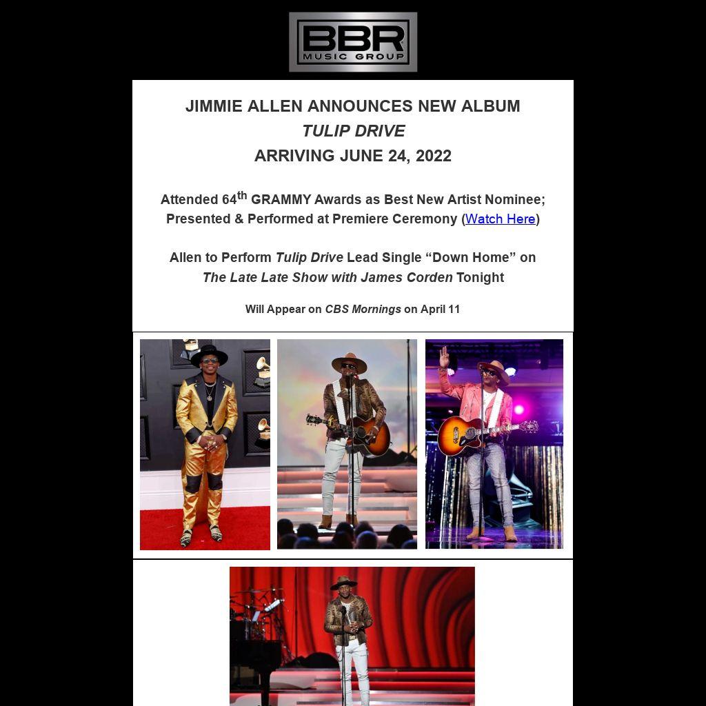 April 4, 2022 – On the heels of a highlight first GRAMMY® Awards weekend, multi-platinum recording artist Jimmie Allen announced his third album Tulip Drive will arrive Friday, June 24 via Stoney Creek Records/BBR Music Group. The lead single from the record – “Down Home” – is available everywhere now, and Allen will perform it tonight on The Late Late Show with James Corden on CBS.