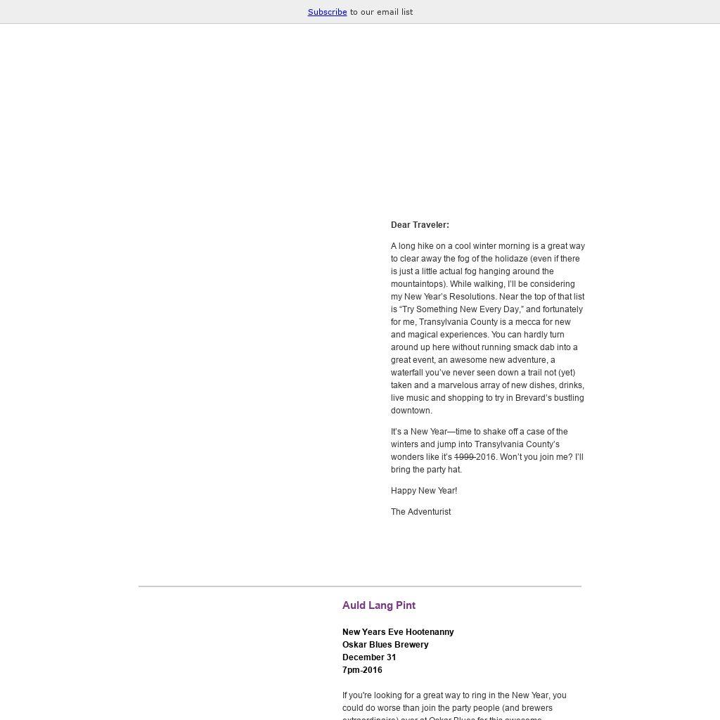 It’s a New Year—time to shake off a case of the winters and jump into Transylvania County’s wonders like it’s 1999 2016. Won’t you join me? I’ll bring the party hat.