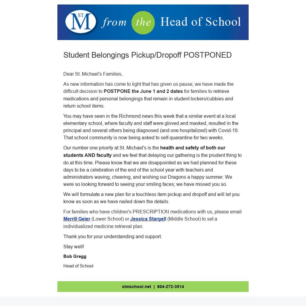 As new information has come to light that has given us pause, we have made the difficult decision to POSTPONE the June 1 and 2 dates for families to retrieve medications and personal belongings that remain in student lockers/cubbies and return school items.