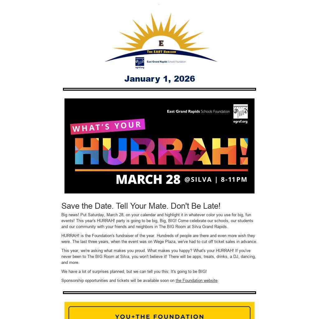 Big news! Put Saturday, March 28, on your calendar and highlight it in whatever color you use for big, fun events! This year's HURRAH! party is going to be big, Big, BIG! Come celebrate our schools, our students and our community with your friends and neighbors in The BIG Room at Silva Grand Rapids.