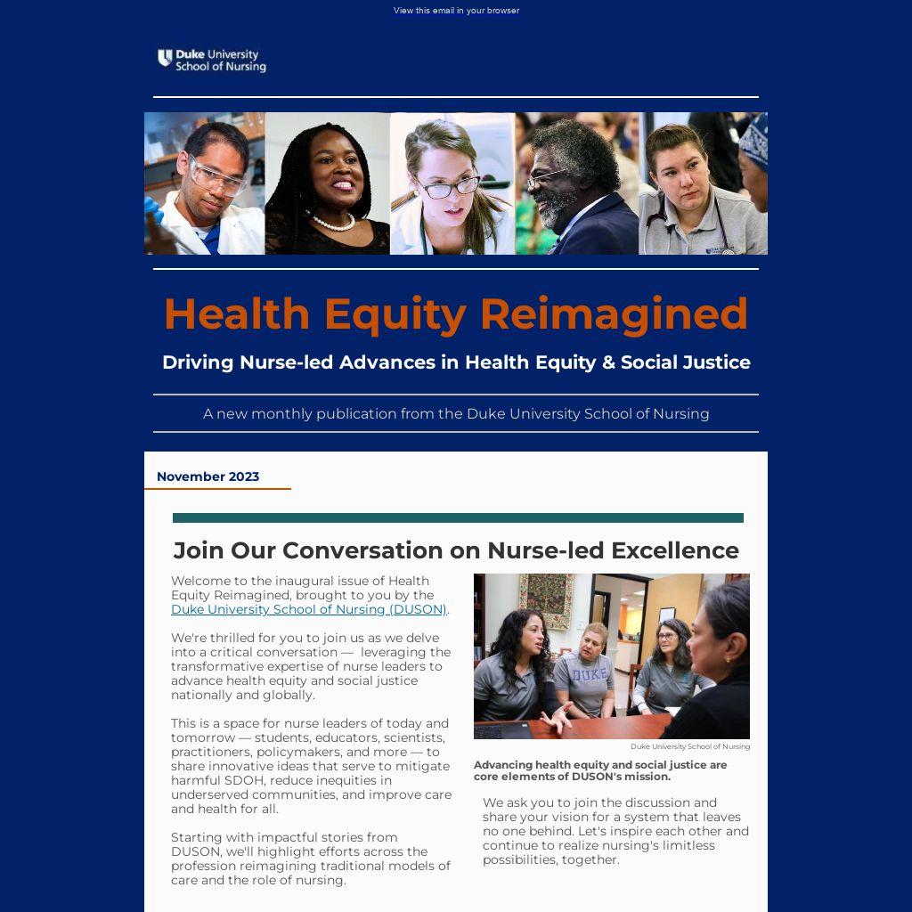 Welcome to the inaugural issue of Health Equity Reimagined, brought to you by the Duke University School of Nursing (DUSON).