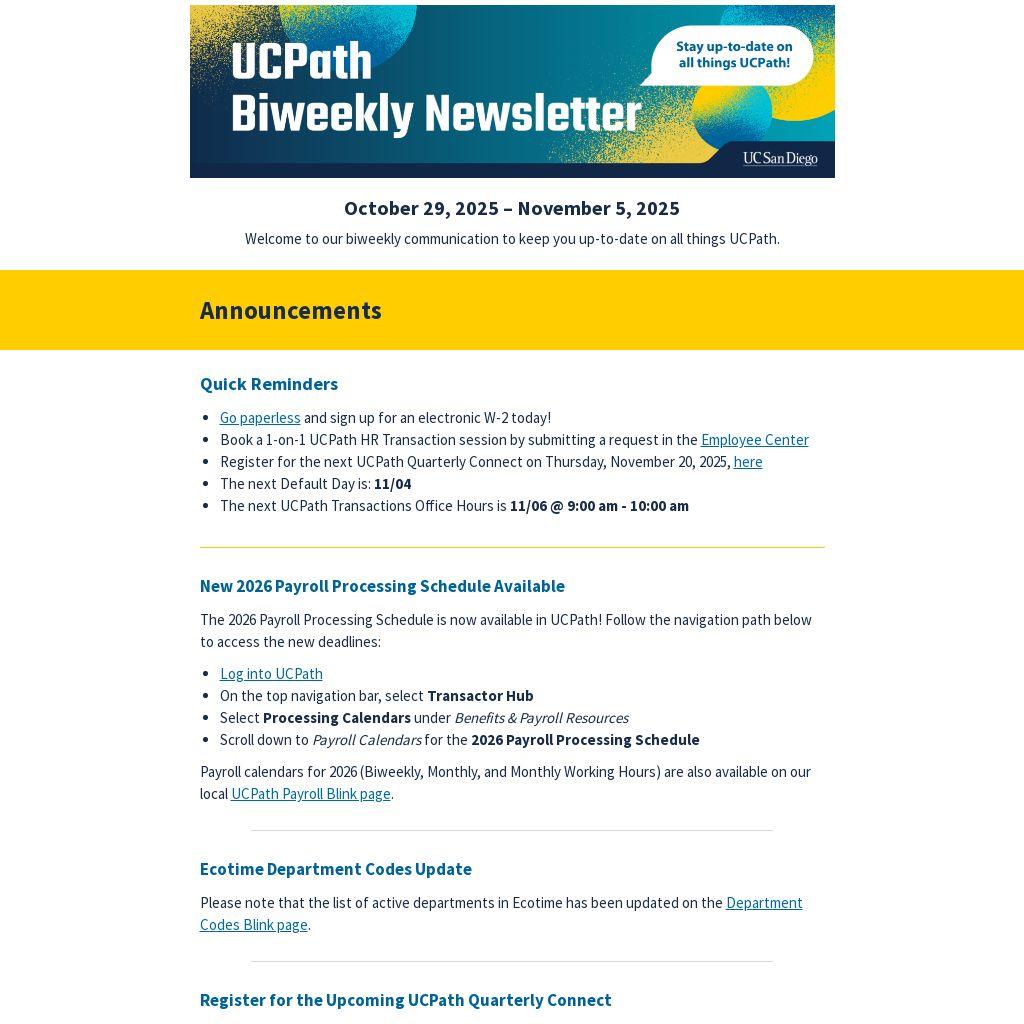 - Register for the next UCPath Quarterly Connect on Thursday, November 20, 2025, here