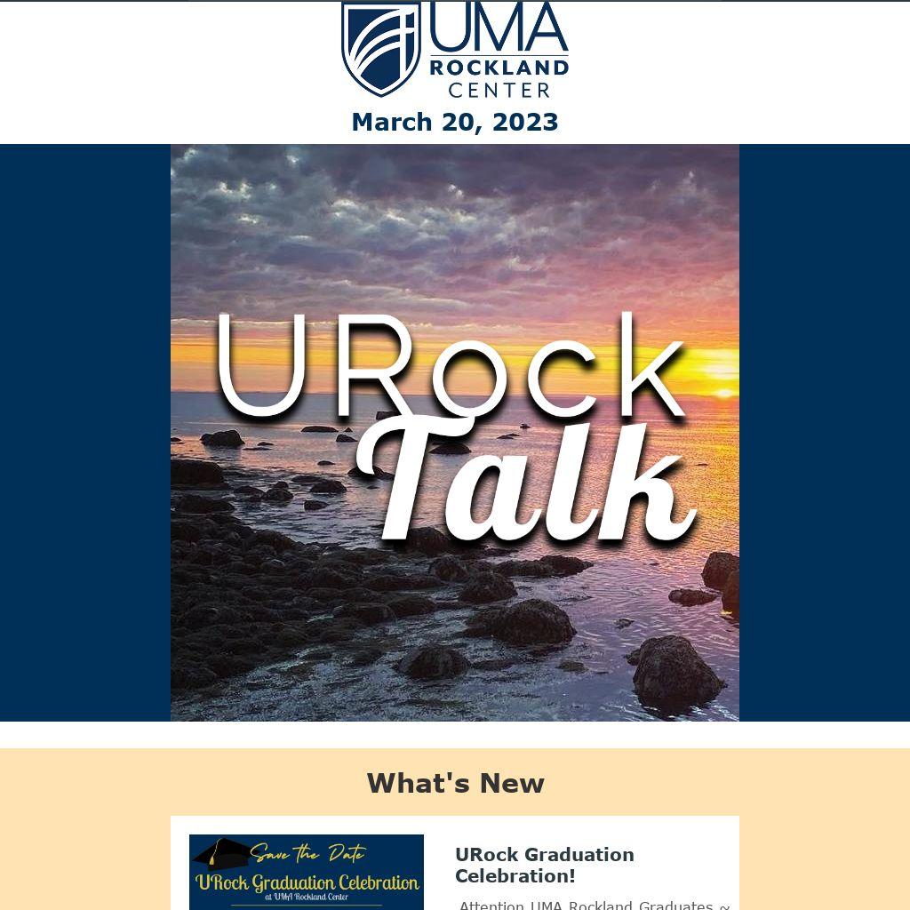 Attention UMA Rockland Graduates ~ Planning has begun for our local Graduation Celebration to be held on Saturday, April 29th at 4:30pm. Please be sure to Save the Date! You have worked very hard for this accomplishment and we want to celebrate with you. More information will be coming via your University email soon.