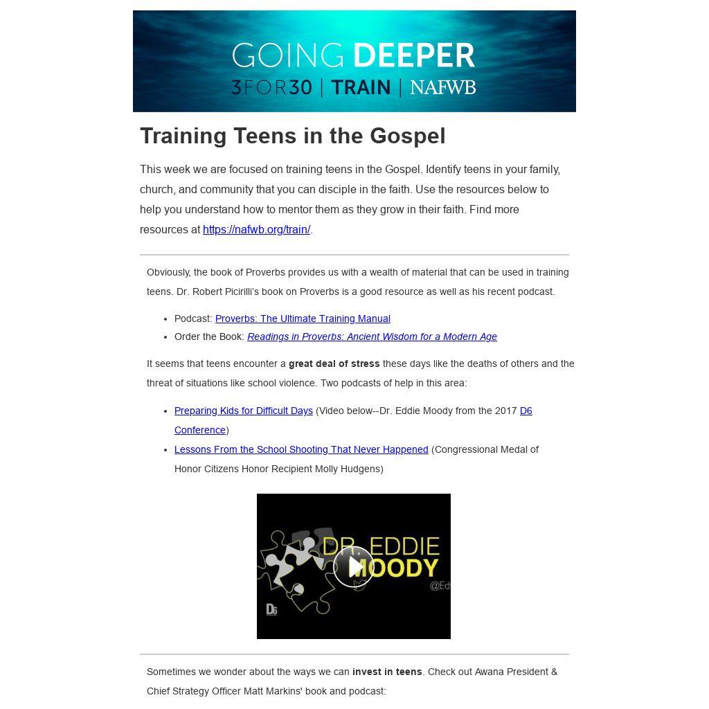 This week we are focused on training teens in the Gospel. Identify teens in your family, church, and community that you can disciple in the faith. Use the resources below to help you understand how to mentor them as they grow in their faith. Find more resources at https://nafwb.org/train/.