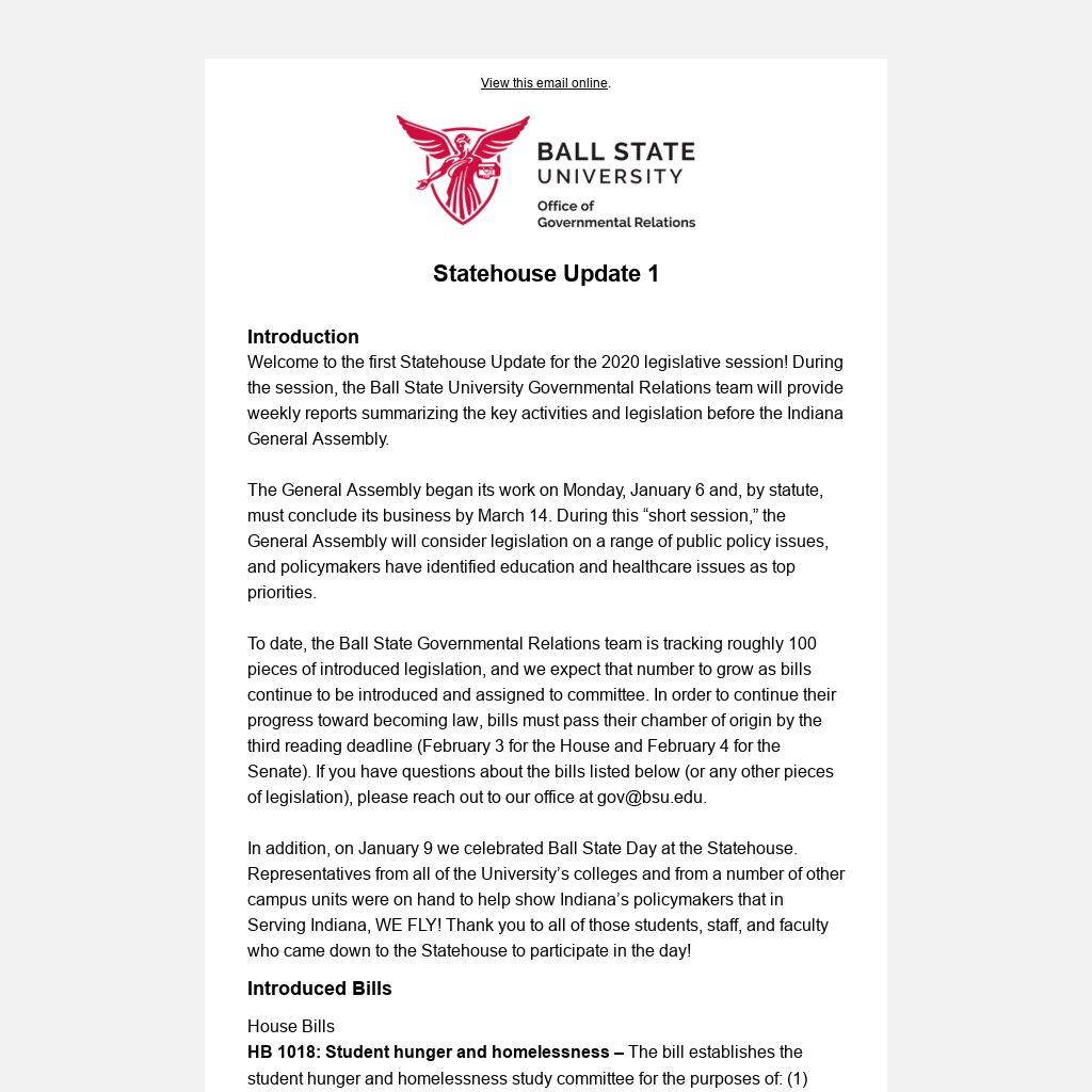 Welcome to the first Statehouse Update for the 2020 legislative session! During the session, the Ball State University Governmental Relations team will provide weekly reports summarizing the key activities and legislation before the Indiana General Assembly.