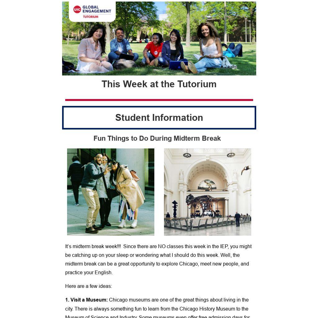 It’s midterm break week!!! Since there are NO classes this week in the IEP, you might be catching up on your sleep or wondering what I should do this week. Well, the midterm break can be a great opportunity to explore Chicago, meet new people, and practice your English.
