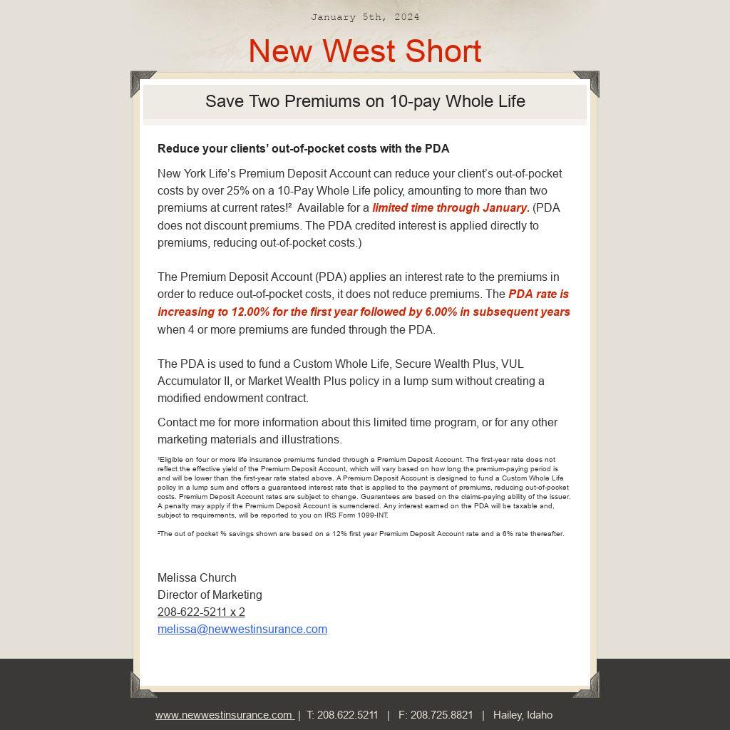 New York Life’s Premium Deposit Account can reduce your client’s out-of-pocket costs by over 25% on a 10-Pay Whole Life policy, amounting to more than two premiums at current rates!² Available for a limited time through January. (PDA does not discount premiums. The PDA credited interest is applied directly to premiums, reducing out-of-pocket costs.)
