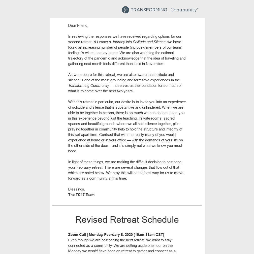 Even though we are postponing the next retreat, we want to stay connected as a community. We are setting aside one hour on the Monday we would have been on retreat to gather and connect as a community. More specific information about this coming soon.
