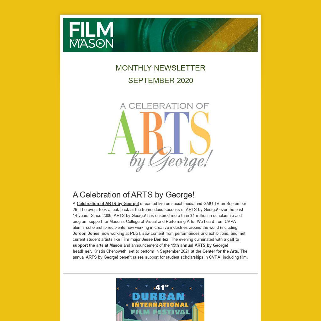 We want to hear from you! If you have news you would like to contribute, please send it to film@gmu.edu. We are looking for regional film events and updates from Film at Mason alumni. Keep up-to-date on all the current Film at Mason news at film.gmu.edu.