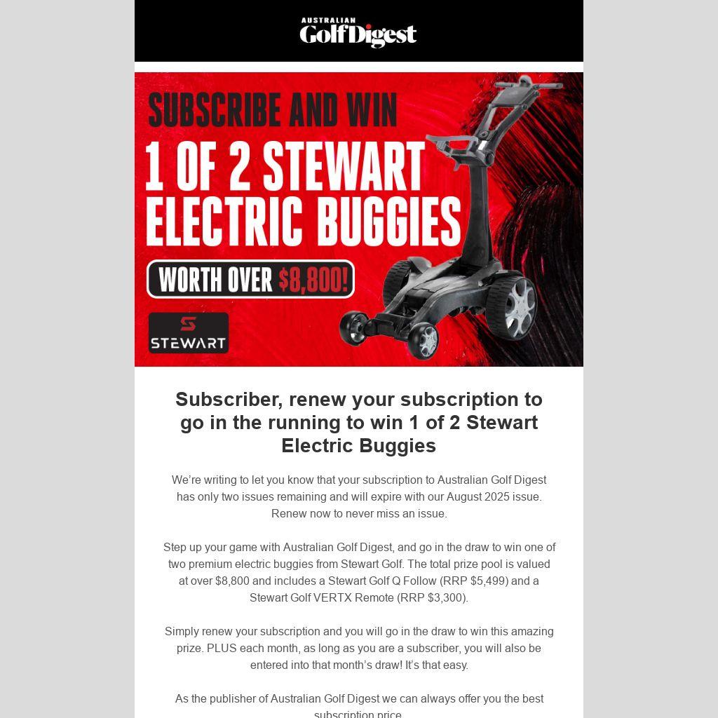 Step up your game with Australian Golf Digest, and go in the draw to win one of two premium electric buggies from Stewart Golf. The total prize pool is valued at over $8,800 and includes a Stewart Golf Q Follow (RRP $5,499) and a Stewart Golf VERTX Remote (RRP $3,300).