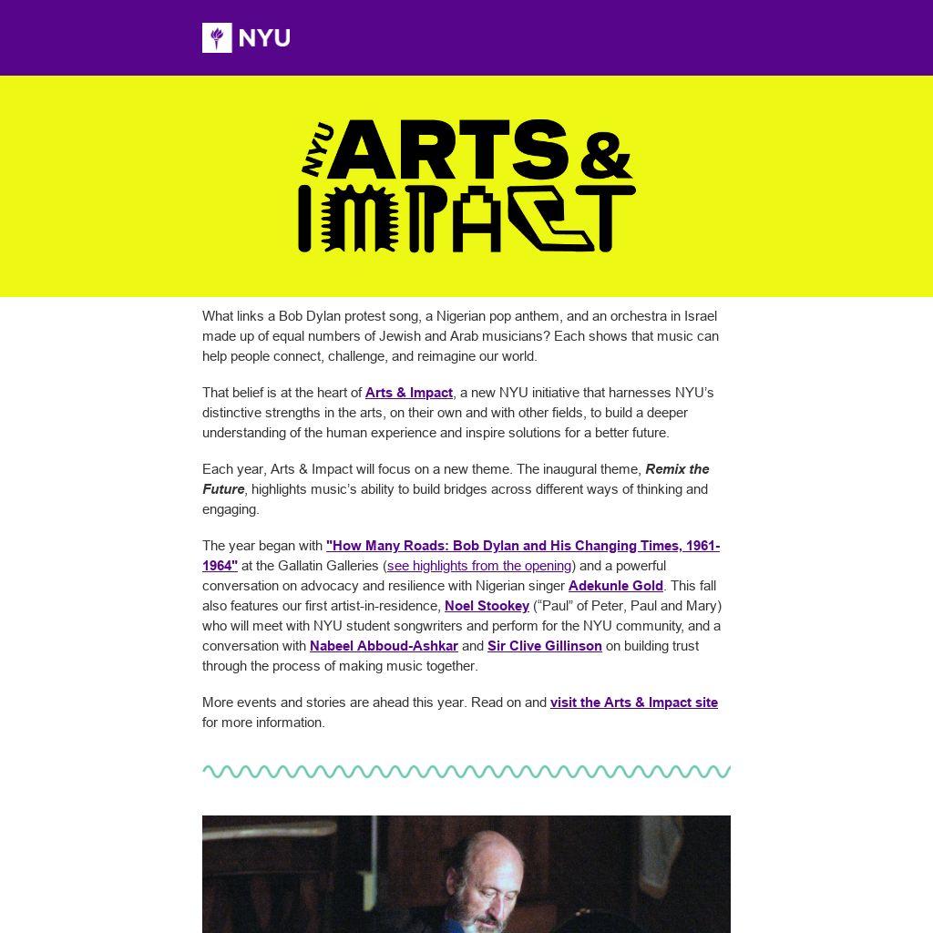 The year began with "How Many Roads: Bob Dylan and His Changing Times, 1961-1964" at the Gallatin Galleries (see highlights from the opening) and a powerful conversation on advocacy and resilience with Nigerian singer Adekunle Gold. This fall also features our first artist-in-residence, Noel Stookey (“Paul” of Peter, Paul and Mary) who will meet with NYU student songwriters and perform for the NYU community, and a conversation with Nabeel Abboud-Ashkar and Sir Clive Gillinson on building trust through the process of making music together.