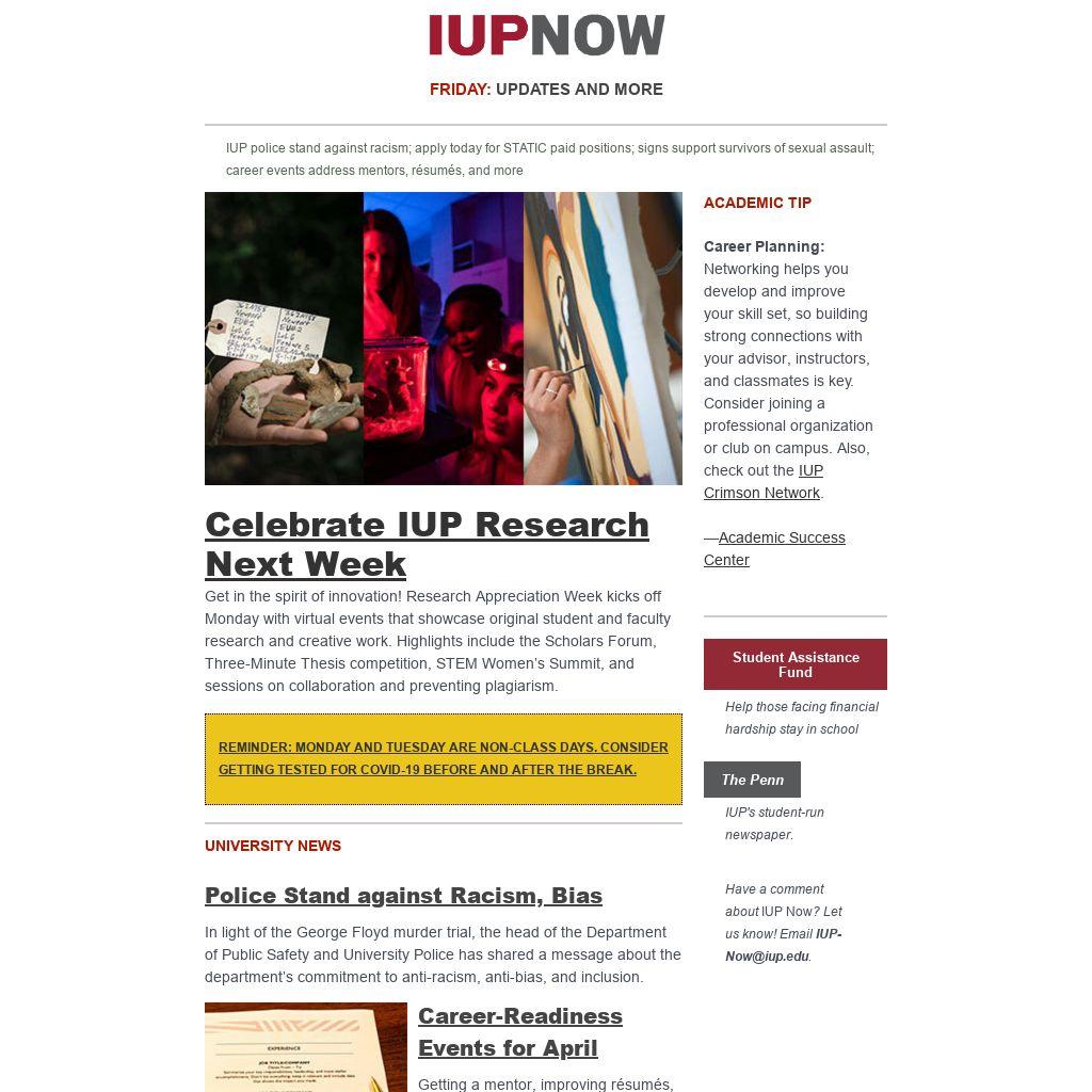 Distributed to IUP employees and students four days a week, IUP Now is the official newsletter of Indiana University of Pennsylvania. It features news from across the IUP website, compiled by the Division of Marketing and Communications. Find out how to get your news and events in IUP Now.
