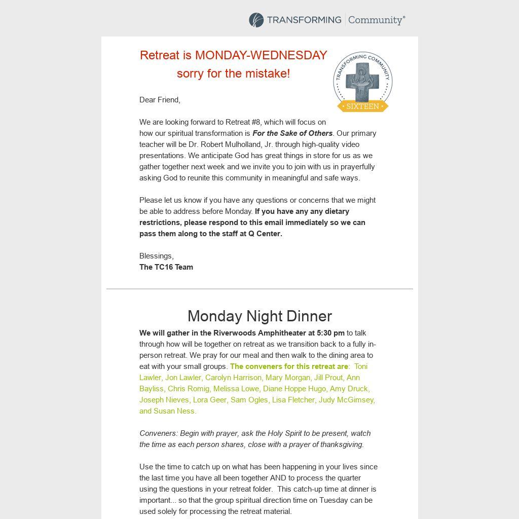 We are looking forward to Retreat #8, which will focus on how our spiritual transformation is For the Sake of Others. Our primary teacher will be Dr. Robert Mulholland, Jr. through high-quality video presentations. We anticipate God has great things in store for us as we gather together next week and we invite you to join with us in prayerfully asking God to reunite this community in meaningful and safe ways.