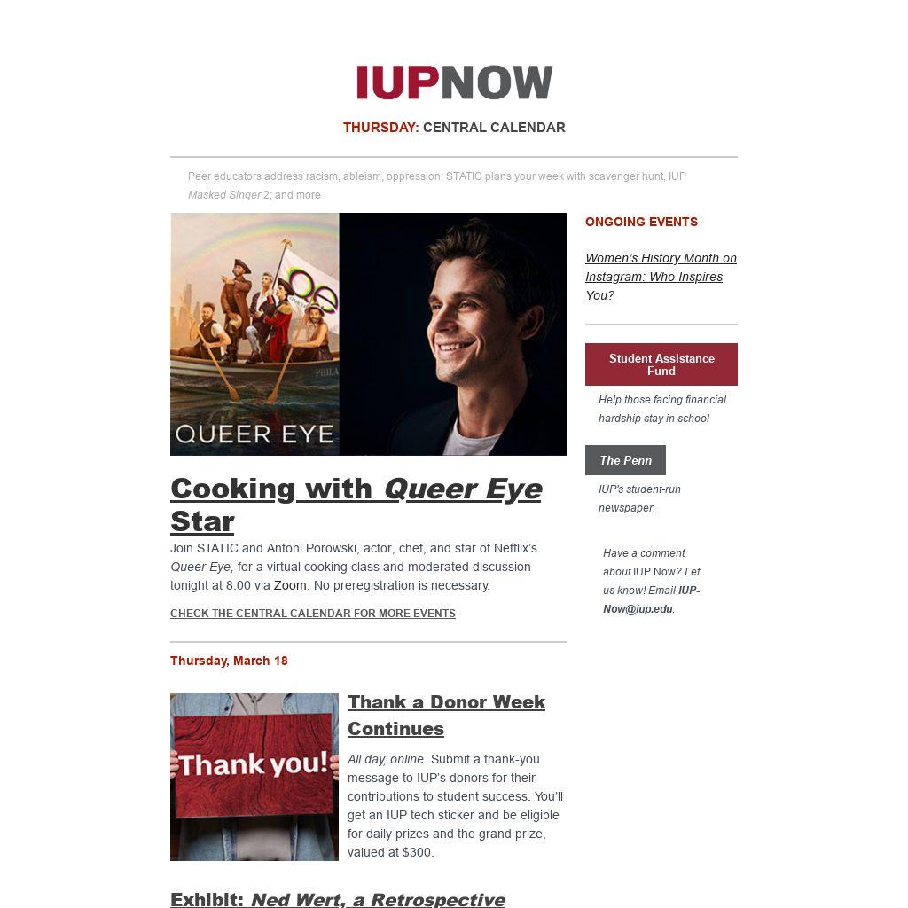 Distributed to IUP employees and students four days a week, IUP Now is the official newsletter of Indiana University of Pennsylvania. It features news from across the IUP website, compiled by the Division of Marketing and Communications. Find out how to get your news and events in IUP Now.