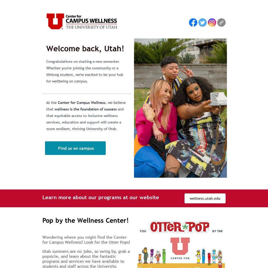 At the Center for Campus Wellness, we believe that wellness is the foundation of success and that equitable access to inclusive wellness services, education and support will create a more resilient, thriving University of Utah.