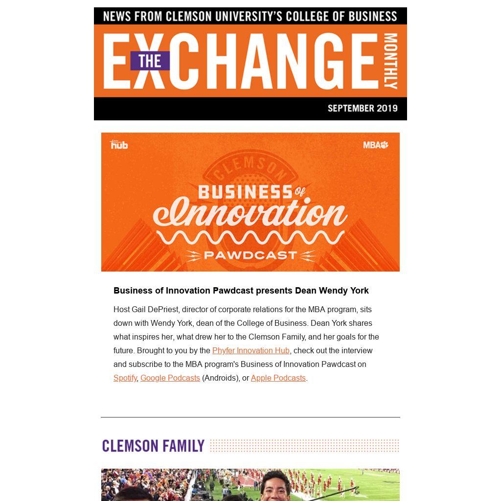 Host Gail DePriest, director of corporate relations for the MBA program, sits down with Wendy York, dean of the College of Business. Dean York shares what inspires her, what drew her to the Clemson Family, and her goals for the future. Brought to you by the Phyfer Innovation Hub, check out the interview and subscribe to the MBA program's Business of Innovation Pawdcast on Spotify, Google Podcasts (Androids), or Apple Podcasts.