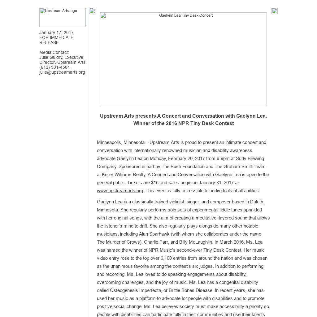 https://violinscratches.com. Upstream Arts is a nonprofit organization in Minneapolis that uses the power of the creative arts to activate and amplify the voice and choice of individuals with disabilities. The organization draws on research and best practices to provide a structured, curriculum-based approach to creating artistic environments in which individuals of all ages and abilities can intersect and develop vital social/emotional and communication skills; and it promotes more connected and engaged communities by increasing intentional opportunities for shared creative experiences. Upstream Arts partners with 80+ school districts, disability service providers, and community organizations annually in order to serve people with disabilities in the places where they are already learning, working, and socializing. Every program is led by a team of highly accomplished local professional artists—including actors, musicians, writers, visual artists, directors, and dancers—who have been trained to engage individuals of all abilities. This year, Upstream Arts will serve more than 3,000 people of all ages and abilities through 100+ programs across the Twin Cities and beyond. Upstream Arts values the creative process as a pathway to community solutions and a framework toward a future where all individuals—regardless of ability—will be engaged, connected, and included in all aspects of society. A Concert and Conversation with Gaelynn Lea will take place in Scheid Hall at Surly Brewing Company (520 Malcolm Ave SE, Minneapolis, MN 55414) on Monday, February 20, 2017 from 6-9pm. The event will begin with a reception from 6-7pm, during which guests can enjoy complimentary refreshments and a cash bar; mix and mingle; and learn about Gaelynn Lea, Upstream Arts, and the event’s sponsors. The program will begin at 7pm and feature two sets of music by Ms. Lea, interspersed with her personal stories about disability advocacy and the arts. Tickets are $15 and sales will begin January 31, 2017 at www.upstreamarts.org or by calling Upstream Arts at (612) 331-4584. Space is limited, so reservations are highly recommended. This event will be fully accessible for individuals of all abilities, including ASL interpretation. Throughout the evening, guests will have opportunities to purchase Gaelynn Lea merchandise and donate to Upstream Arts.