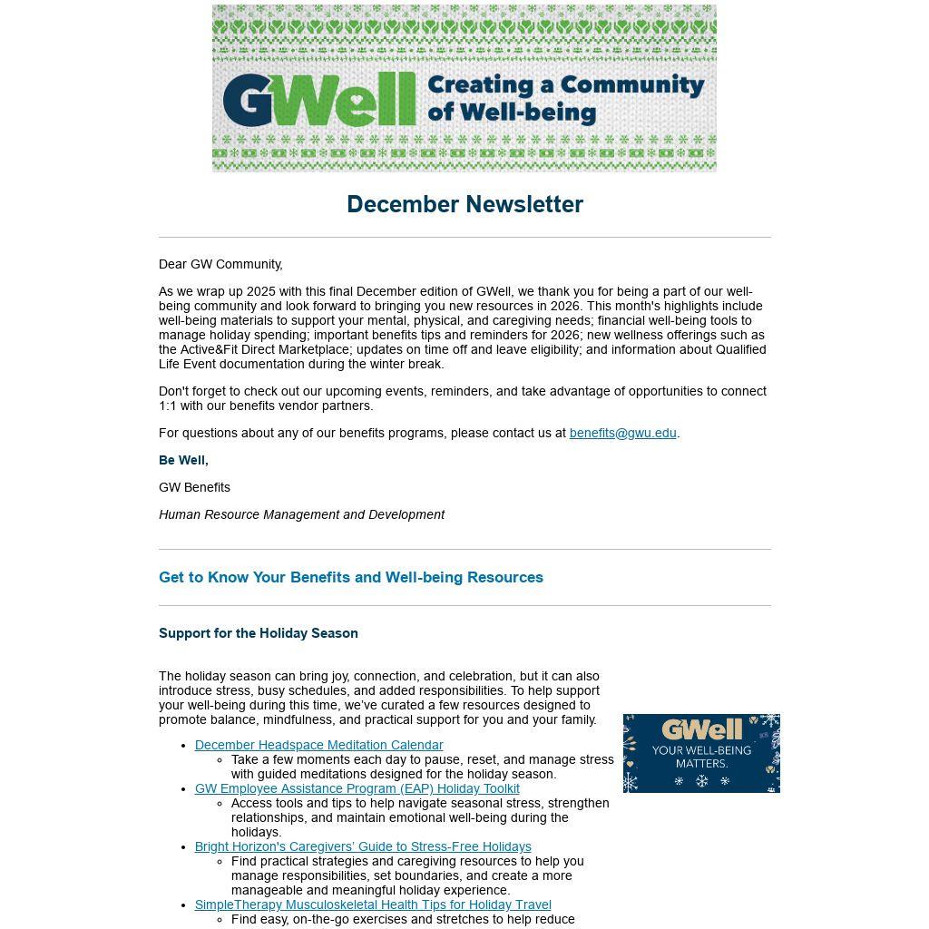 As we wrap up 2025 with this final December edition of GWell, we thank you for being a part of our well-being community and look forward to bringing you new resources in 2026. This month's highlights include well-being materials to support your mental, physical, and caregiving needs; financial well-being tools to manage holiday spending; important benefits tips and reminders for 2026; new wellness offerings such as the Active&Fit Direct Marketplace; updates on time off and leave eligibility; and information about Qualified Life Event documentation during the winter break.