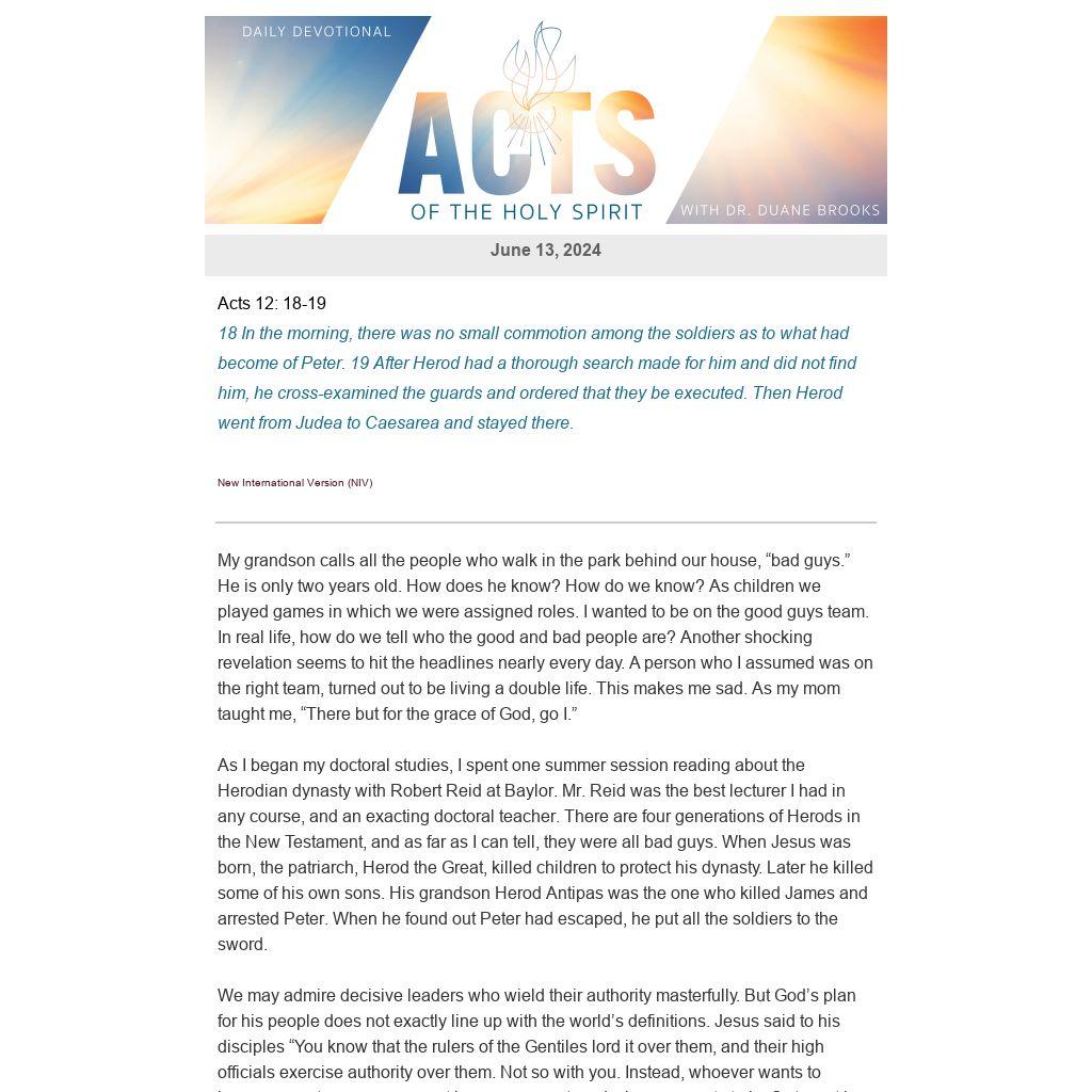 As I began my doctoral studies, I spent one summer session reading about the Herodian dynasty with Robert Reid at Baylor. Mr. Reid was the best lecturer I had in any course, and an exacting doctoral teacher. There are four generations of Herods in the New Testament, and as far as I can tell, they were all bad guys. When Jesus was born, the patriarch, Herod the Great, killed children to protect his dynasty. Later he killed some of his own sons. His grandson Herod Antipas was the one who killed James and arrested Peter. When he found out Peter had escaped, he put all the soldiers to the sword.