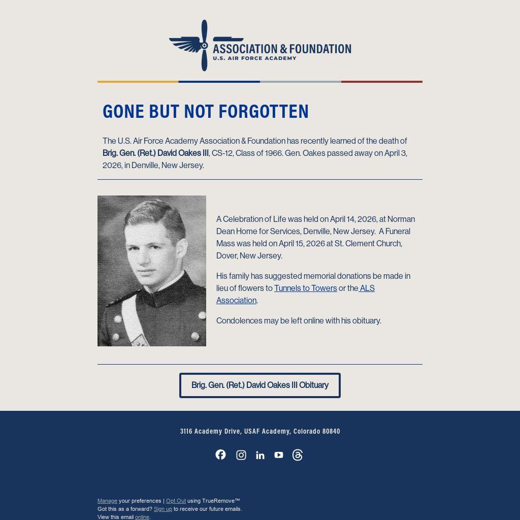 The U.S. Air Force Academy Association & Foundation has recently learned of the death of Brig. Gen. (Ret.) David Oakes III, CS-12, Class of 1966. Gen. Oakes passed away on April 3, 2026, in Denville, New Jersey.