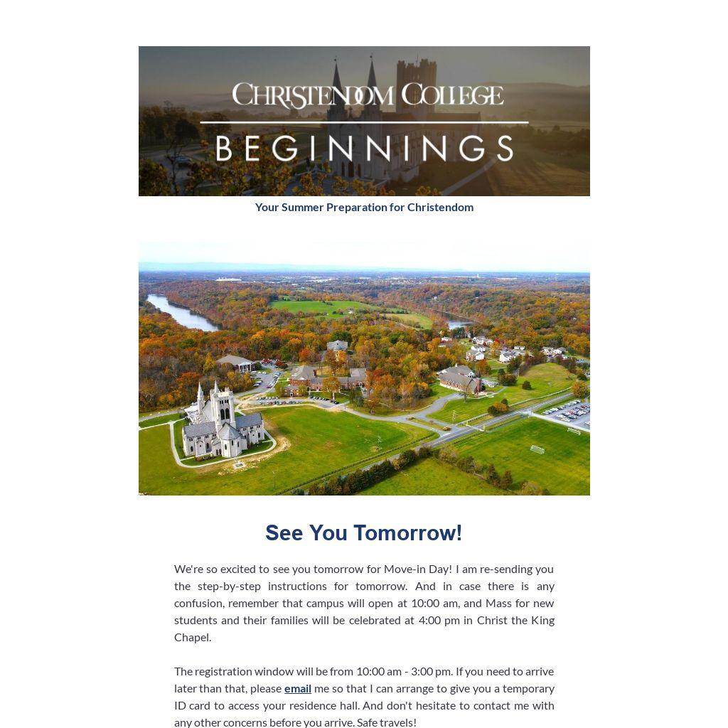 We're so excited to see you tomorrow for Move-in Day! I am re-sending you the step-by-step instructions for tomorrow. And in case there is any confusion, remember that campus will open at 10:00 am, and Mass for new students and their families will be celebrated at 4:00 pm in Christ the King Chapel.