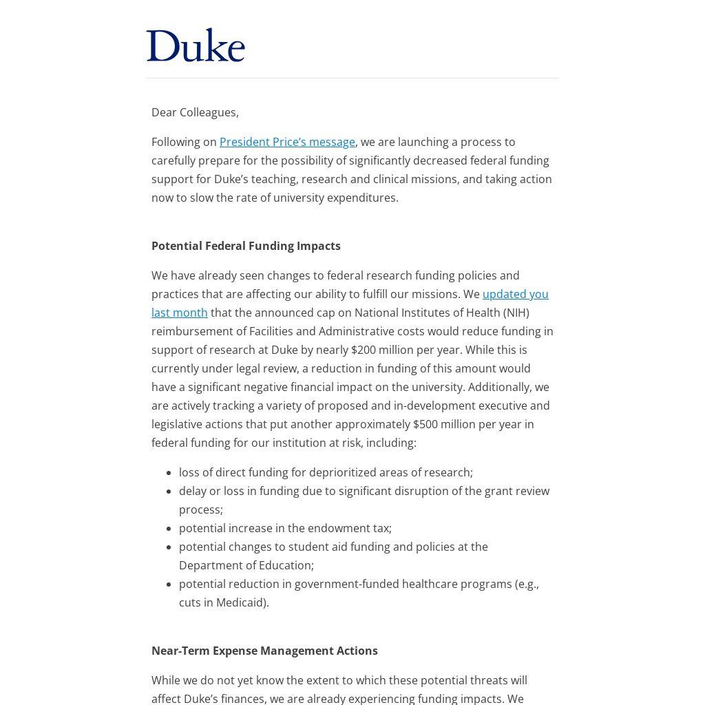 Following on President Price’s message, we are launching a process to carefully prepare for the possibility of significantly decreased federal funding support for Duke’s teaching, research and clinical missions, and taking action now to slow the rate of university expenditures.