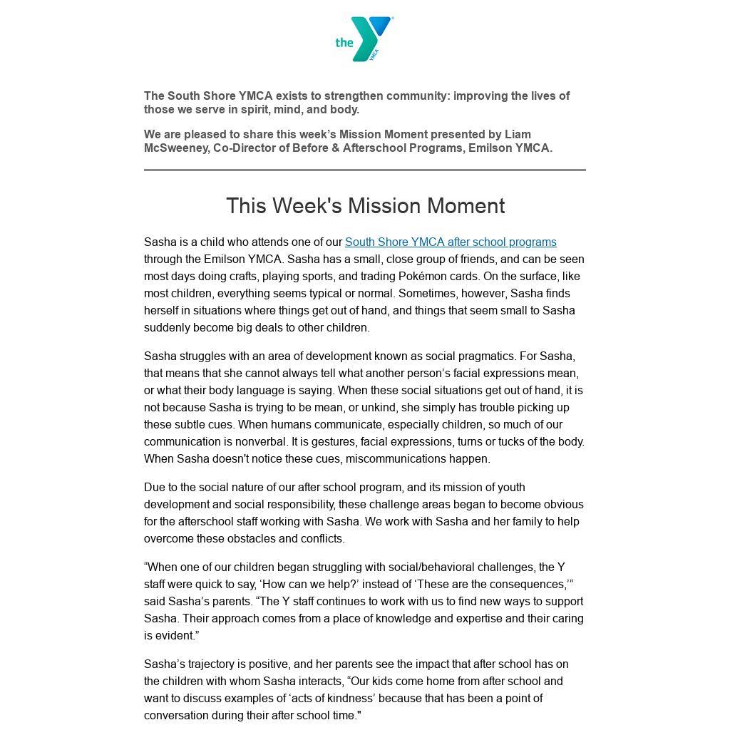 Sasha is in the process of getting more support through the public school system, and in the meantime, her parents are grateful for a place like the South Shore YMCA after school program for helping their daughter progress. “The afterschool program is so much more than a place for our children to be supervised,” said Sasha’s parents, “It is a place where their social emotional development continues to be encouraged and supported".