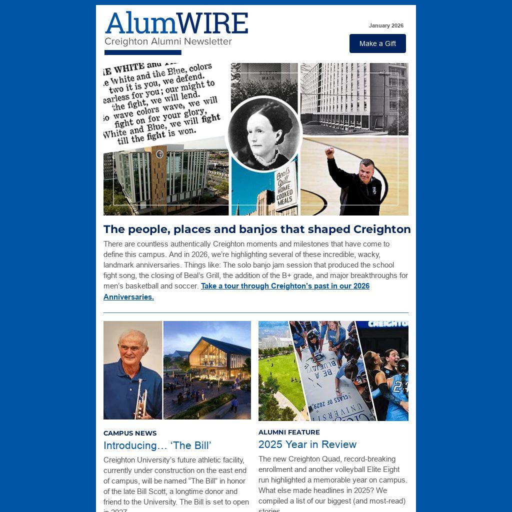 There are countless authentically Creighton moments and milestones that have come to define this campus. And in 2026, we’re highlighting several of these incredible, wacky, landmark anniversaries. Things like: The solo banjo jam session that produced the school fight song, the closing of Beal’s Grill, the addition of the B+ grade, and major breakthroughs for men’s basketball and soccer. Take a tour through Creighton’s past in our 2026 Anniversaries.