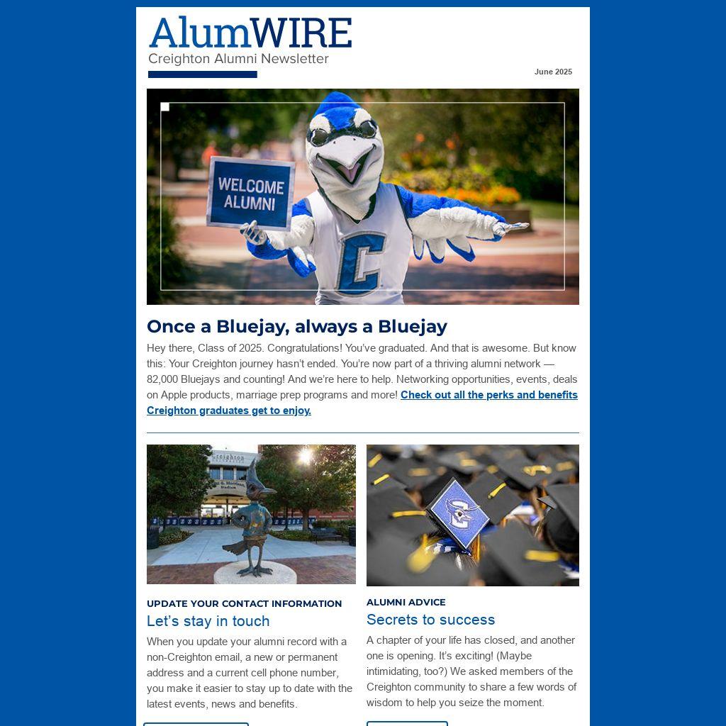This is our alumni newsletter. And once a month, generally on the second Tuesday, it drops in your email inbox. You can read it. Or not. Just know, it’s designed specifically for Creighton graduates like you, and it’s a great way to stay connected to campus.