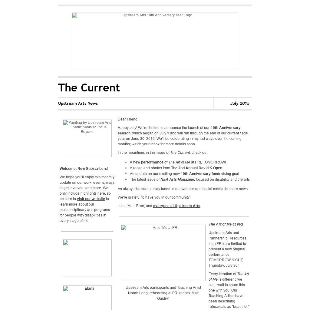 | Dear Friend, Happy July! We're thrilled to announce the launch of our 10th Anniversary season, which began on July 1 and will run through the end of our current fiscal year on June 30, 2016. We'll be celebrating in myriad ways over the coming months; watch your inbox for more details soon. In the meantime, in this issue of The Current, check out:- A new performance of The Art of Me at PRI, TOMORROW!