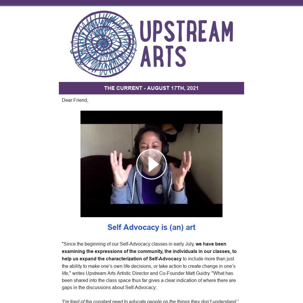 "Since the beginning of our Self-Advocacy classes in early July, we have been examining the expressions of the community, the individuals in our classes, to help us expand the characterization of Self-Advocacy to include more than just the ability to make one’s own life decisions, or take action to create change in one’s life," writes Upstream Arts Artistic Director and Co-Founder Matt Guidry. "What has been shared into the class space thus far gives a clear indication of where there are gaps in the discussions about Self-Advocacy: