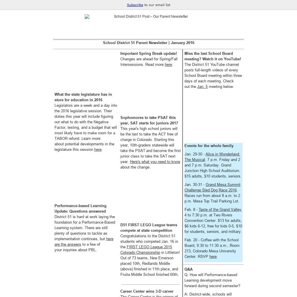 Stay informed about school and district news and events by visiting our newly-redesigned blog at d51news.org. In addition to news releases, you'll find lunch menus, calendars, and updates on Performance-based Learning.