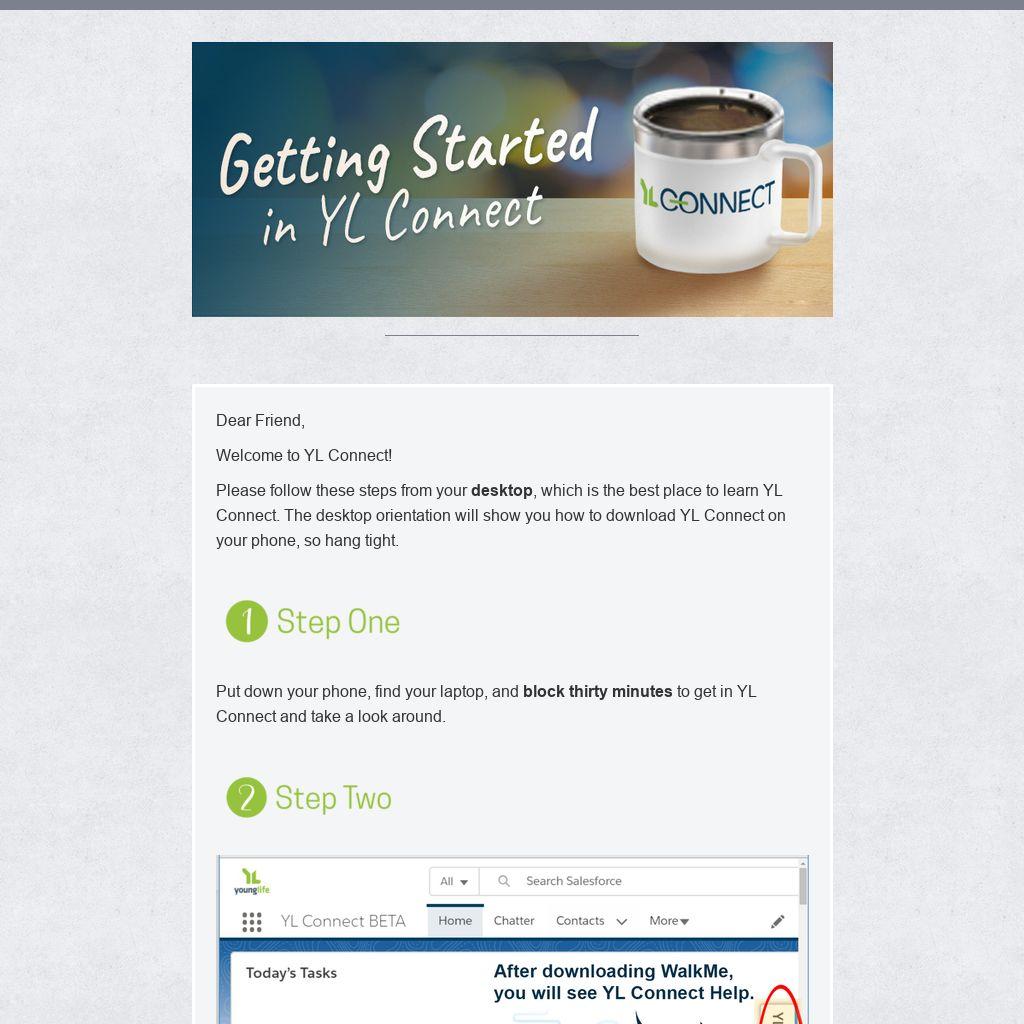 Within Chrome, Edge, or a Firefox browser, download the WalkMe extension to enable your online guide — YL Connect Help. All the basic information regarding YL Connect is here — including the four orientation assignments to go ankle deep, so don’t skip this step! Depending on your browser, you may need to allow it access to the websites you visit. (Questions? Call 877-957-2435 or email helpdesk@sc.younglife.org.)