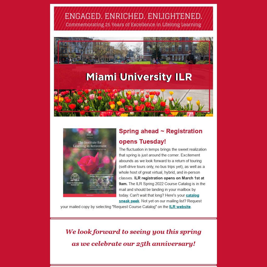 Silver spring: ILR turns 25!Spring 2022 will be a semester to remember as we commemorate our 25th anniversary. We're thrilled you're here and invite you to join us this semester as we celebrate a quarter-century of Engaging, Enriching, and Enlightening our community. Since 1997, we have focused on making a positive difference in the lives of the lifelong learners of our community. We trust you'll agree that we are fulfilling our mission in a big way.