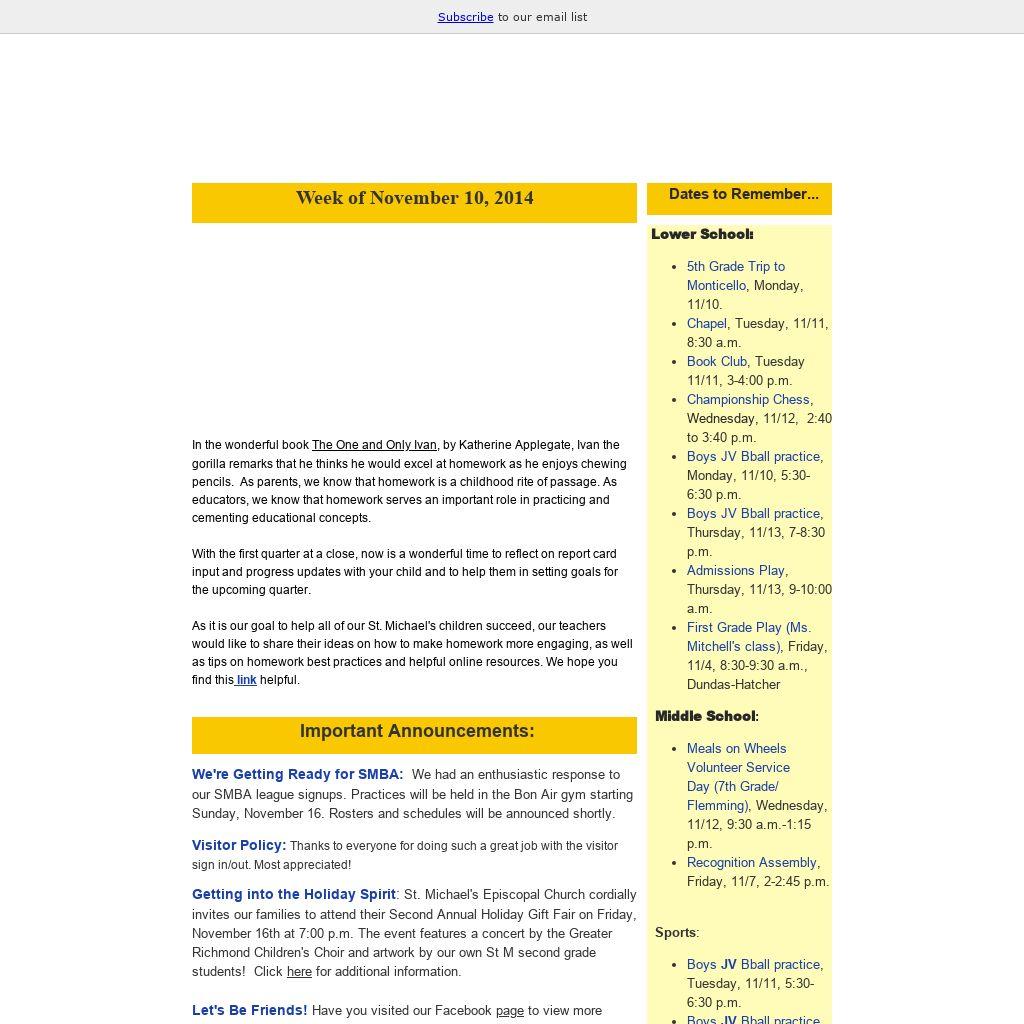 Getting into the Holiday Spirit: St. Michael's Episcopal Church cordially invites our families to attend their Second Annual Holiday Gift Fair on Friday, November 16th at 7:00 p.m. The event features a concert by the Greater Richmond Children's Choir and artwork by our own St M second grade students! Click here for additional information.