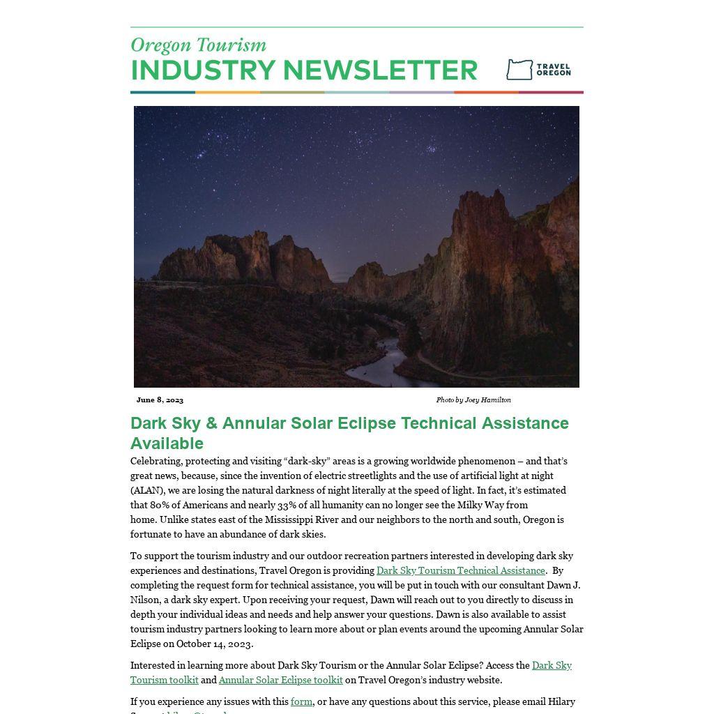 To support the tourism industry and our outdoor recreation partners interested in developing dark sky experiences and destinations, Travel Oregon is providing Dark Sky Tourism Technical Assistance. By completing the request form for technical assistance, you will be put in touch with our consultant Dawn J. Nilson, a dark sky expert. Upon receiving your request, Dawn will reach out to you directly to discuss in depth your individual ideas and needs and help answer your questions. Dawn is also available to assist tourism industry partners looking to learn more about or plan events around the upcoming Annular Solar Eclipse on October 14, 2023.