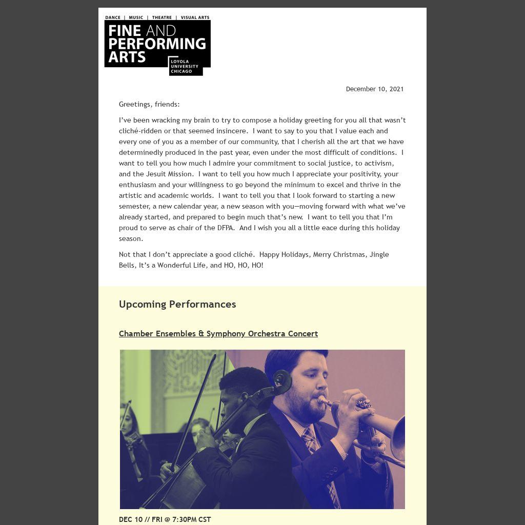 I’ve been wracking my brain to try to compose a holiday greeting for you all that wasn’t cliché-ridden or that seemed insincere. I want to say to you that I value each and every one of you as a member of our community, that I cherish all the art that we have determinedly produced in the past year, even under the most difficult of conditions. I want to tell you how much I admire your commitment to social justice, to activism, and the Jesuit Mission. I want to tell you how much I appreciate your positivity, your enthusiasm and your willingness to go beyond the minimum to excel and thrive in the artistic and academic worlds. I want to tell you that I look forward to starting a new semester, a new calendar year, a new season with you—moving forward with what we’ve already started, and prepared to begin much that’s new. I want to tell you that I’m proud to serve as chair of the DFPA. And I wish you all a little eace during this holiday season.