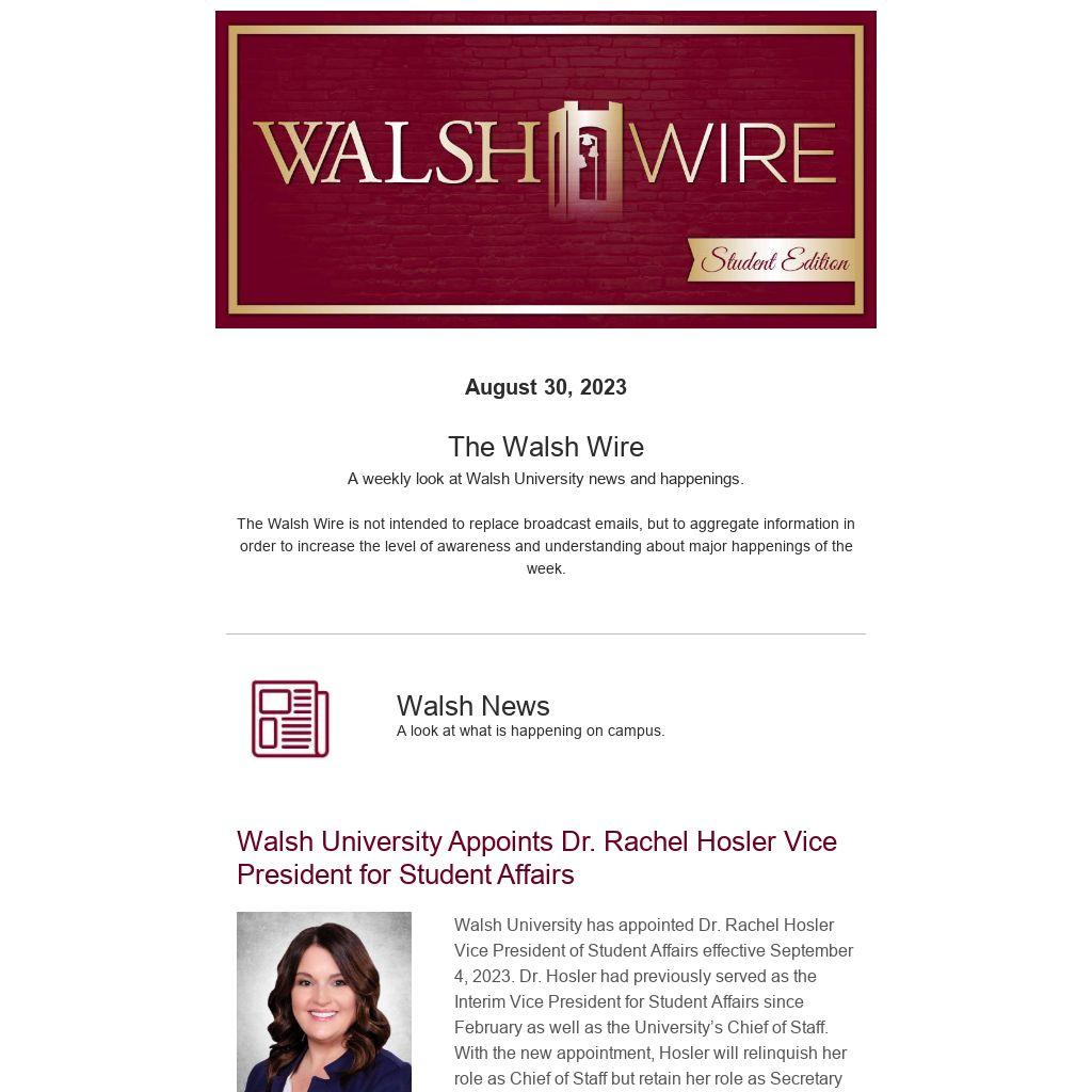 Walsh University has appointed Dr. Rachel Hosler Vice President of Student Affairs effective September 4, 2023. Dr. Hosler had previously served as the Interim Vice President for Student Affairs since February as well as the University’s Chief of Staff. With the new appointment, Hosler will relinquish her role as Chief of Staff but retain her role as Secretary on Walsh University’s Board of Directors.