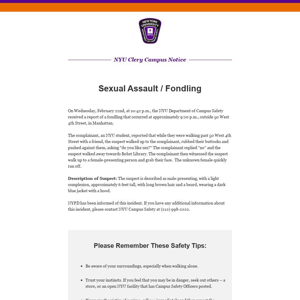 On Wednesday, February 22nd, at 10:42 p.m., the NYU Department of Campus Safety received a report of a fondling that occurred at approximately 9:20 p.m., outside 50 West 4th Street, in Manhattan.