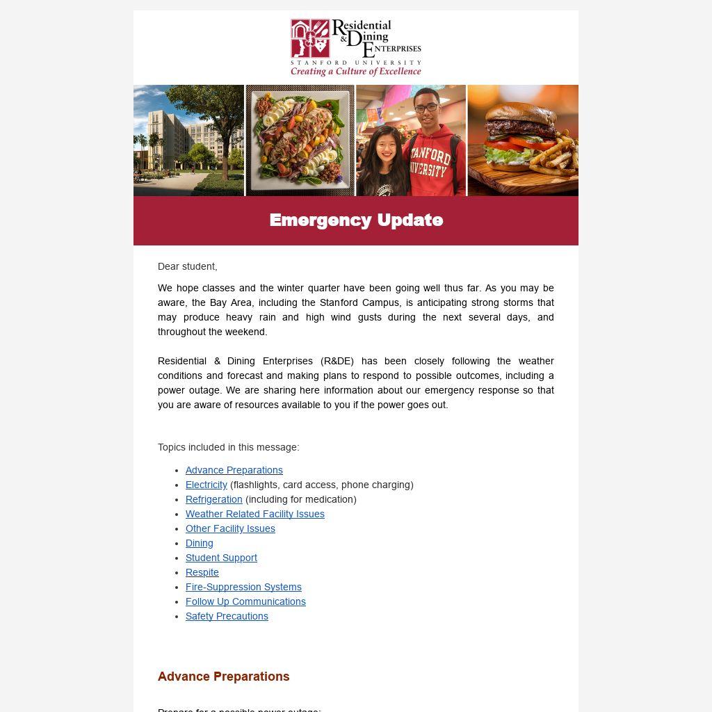 Flashlight. R&DE staff will deliver flashlights to dining halls serving students without power as soon as possible following an outage. If you do not already own a flashlight, you may retrieve one at your respective dining hall during normal operating hours, when storm conditions permit.
