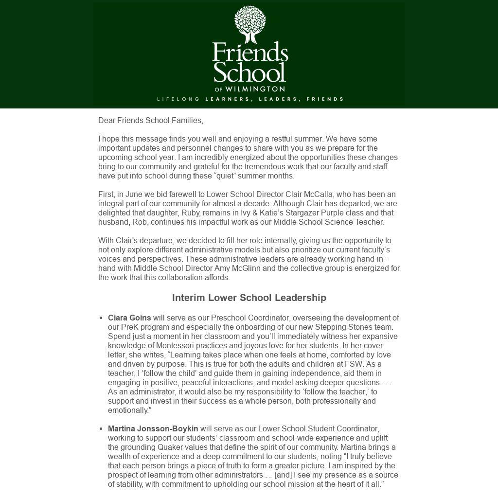 Friends, I am tremendously grateful for your continued support and commitment to Friends School of Wilmington. This community–its people, values, and achievements–shine so brightly, and I look forward to a very successful year ahead (and the school’s 30th anniversary as well)!