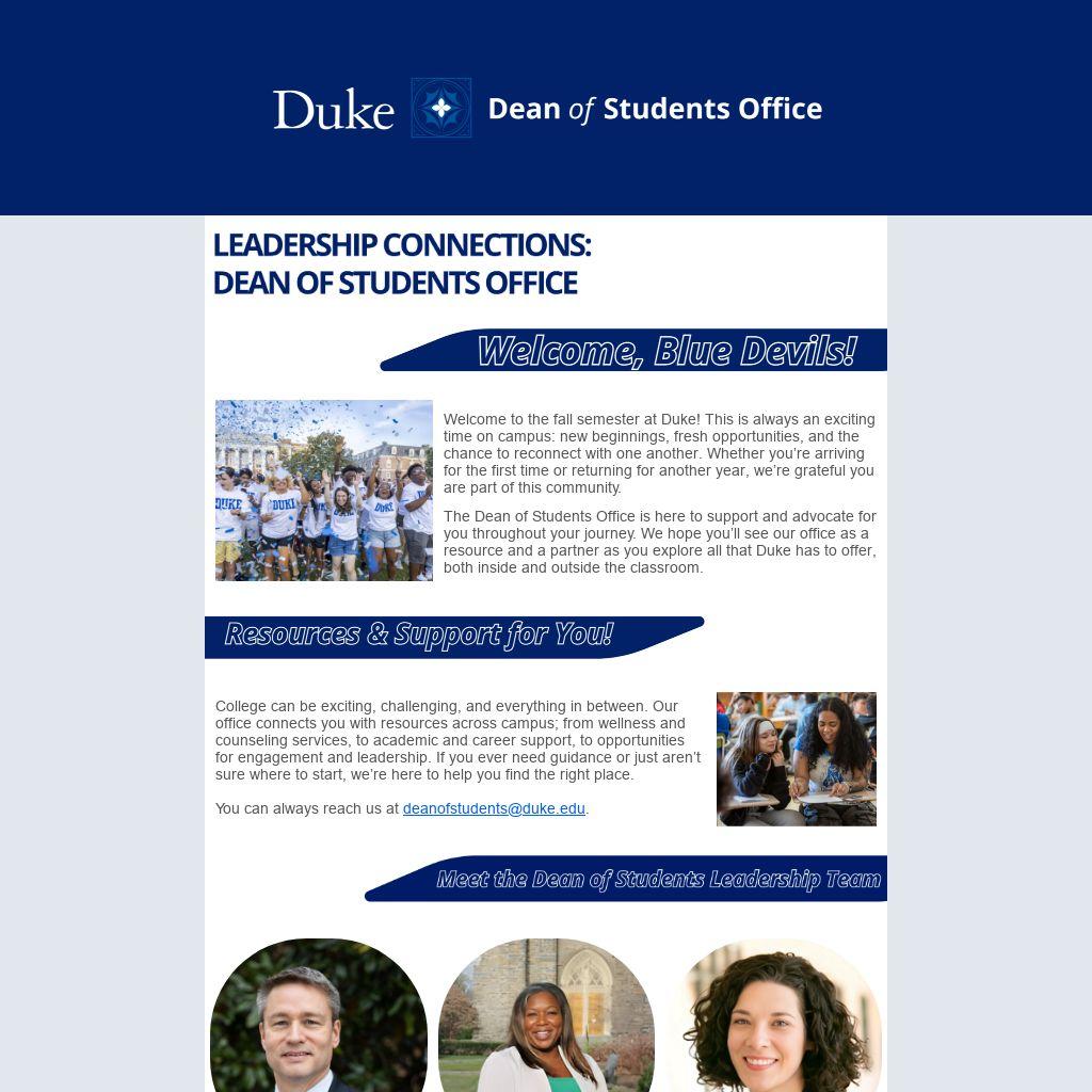 The Dean of Students Office is here to support and advocate for you throughout your journey. We hope you’ll see our office as a resource and a partner as you explore all that Duke has to offer, both inside and outside the classroom.
