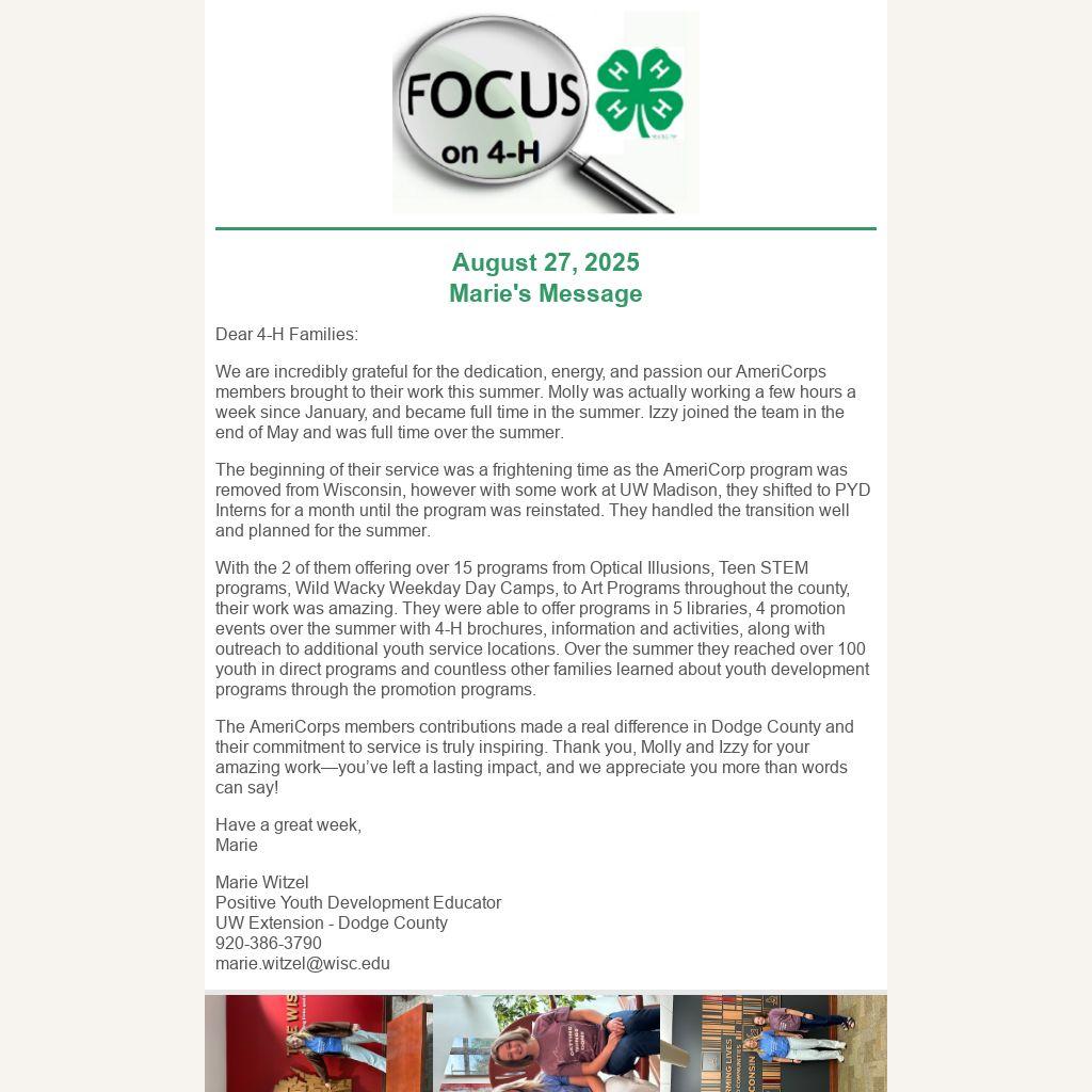 With all of the changes in the Extension Office, Please send any 4-H or youth development related emails to marie.witzel@wisc.edu